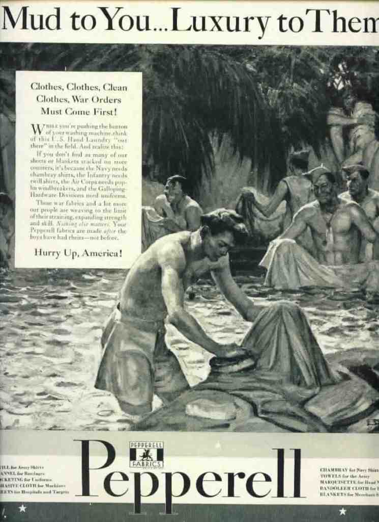 Nor was Cannon the only towel company to promote its products with advertisements featuring naked men engaged in activities, like doing laundry, associated with the gentler sex. A stunning illustration in a 1942 ad for the Pepperell Manufacturing Company of Boston shows the “U.S. Hand Laundry” corps in various stages of undress, cleaning their clothes in a river. With no washing machines or buttons to press, the muscular graphics undoubtedly drew admiration from men, as well as the attention of women.
