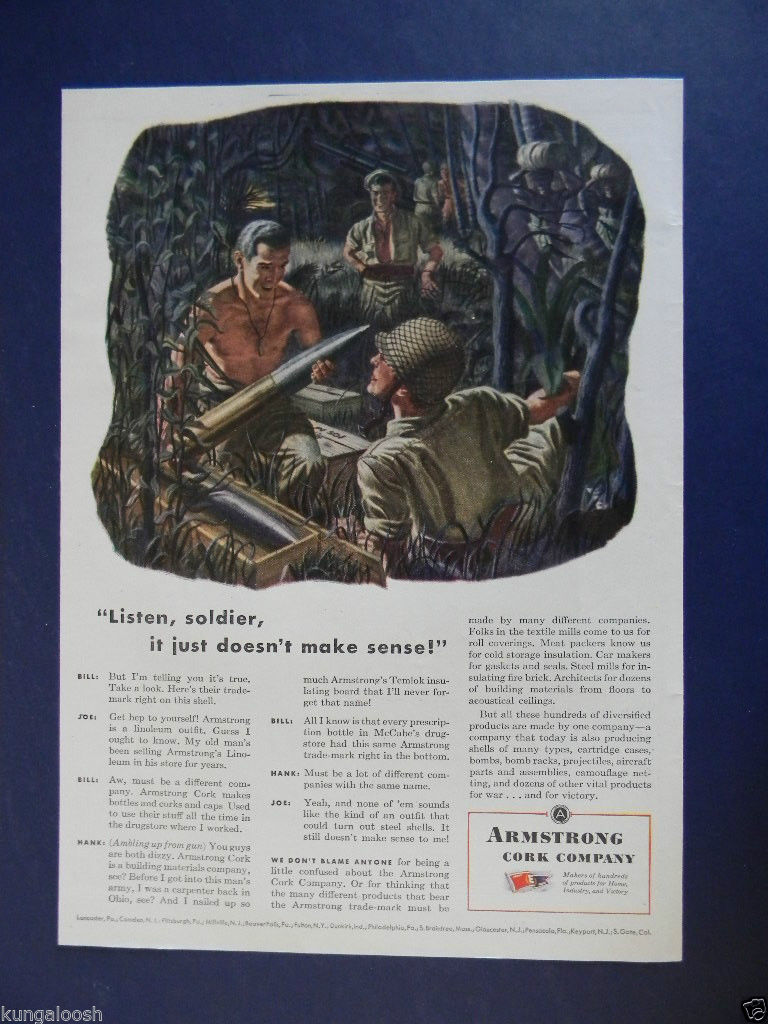 A large piece of artillery from a crate of ammo in hand, another shirtless soldier with a somewhat skeptical but determined look approaches a uniformed GI in a jungle somewhere during the war. As he brandishes the burnished shell at his comrade, the headline in an Armstrong Cork company advertisement screams: “Listen, soldier, it just doesn’t make sense!” Is the shirtless soldier menacing the other man, who’s attempting to talk him out of doing something unwarranted or outlandish?