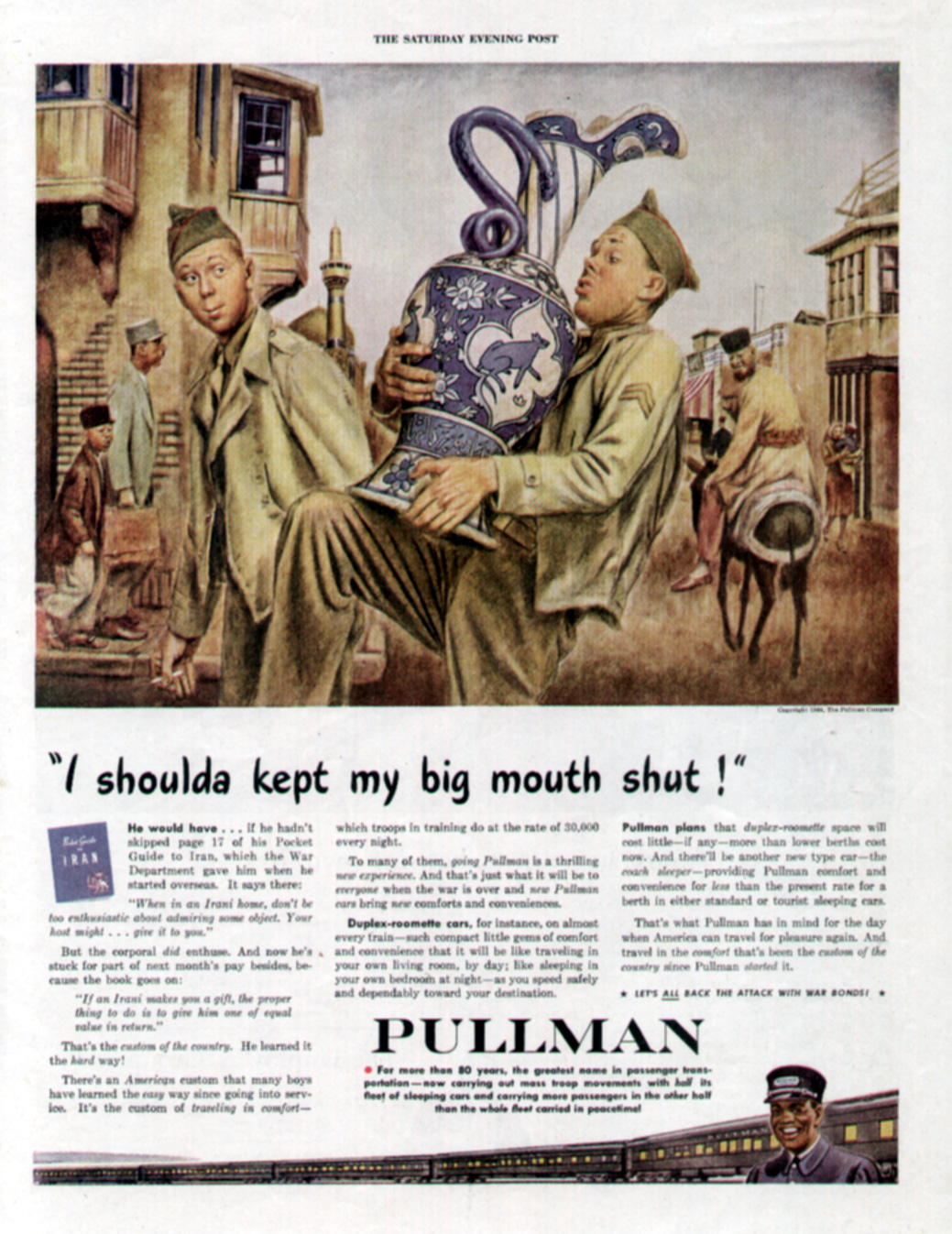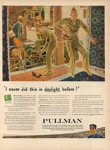 Pullman produced several ads in a series illustrated by Albert Dorne during 1944, when their passenger trains carried troops instead of people traveling for pleasure. In one, two soldiers stationed in Egypt are trying to adapt to a particular custom of the country: taking one’s shoes off before entering a home. But until we’re well into reading the copy, we don’t know that. Instead, as a native looks on suspiciously, two GIs guiltily remove their footwear in the threshold of a building. The ad’s headline — “I never did this in daylight before!” — adds to the illicit sense that the soldiers have been caught doing something for which they can be discharged today. “Back home, he came in the house with his shoes in his hand only when he’d stayed out late — to keep from disturbing Mother and Dad,” begins the copy. The implication? Possibly this: He might have been a good boy back home, but now he’s indulging his baser instincts.