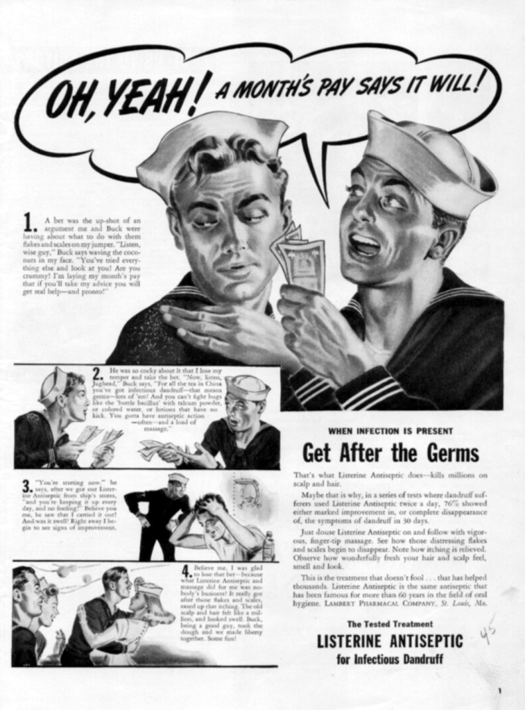 Close-knit sailors — perhaps a bit too close for comfort — appear in a 1945 advertisement for Listerine Antiseptic, touted here as “the tested treatment” for infectious dandruff. “Oh, yeah! A month’s pay says it will!” bets the sailor on the right, referring to Listerine’s ability to get rid of the flakes and scales on his buddy’s jumper. Head cocked aggressively with his face uplifted and an expression of bully daring about him, the sailor holds out some money in his left hand while his companion brushes the dandruff off his shoulder. Chastised and chastened, chagrin is etched deeply across the downcast face and furrowed brow of the embarrassed sailor who’s ashamed to look his friend in the eye. Although hardly effeminate, there’s something soft and feminine about the suffering soldier. Here’s a twist, a role reversal from most (non-combat) advertisements of the time that show a man and woman — where she always tends to be the student to him as the teacher. One guy learns an important lesson about personal hygiene from another in this ad. How domestic and degrading for a military man!