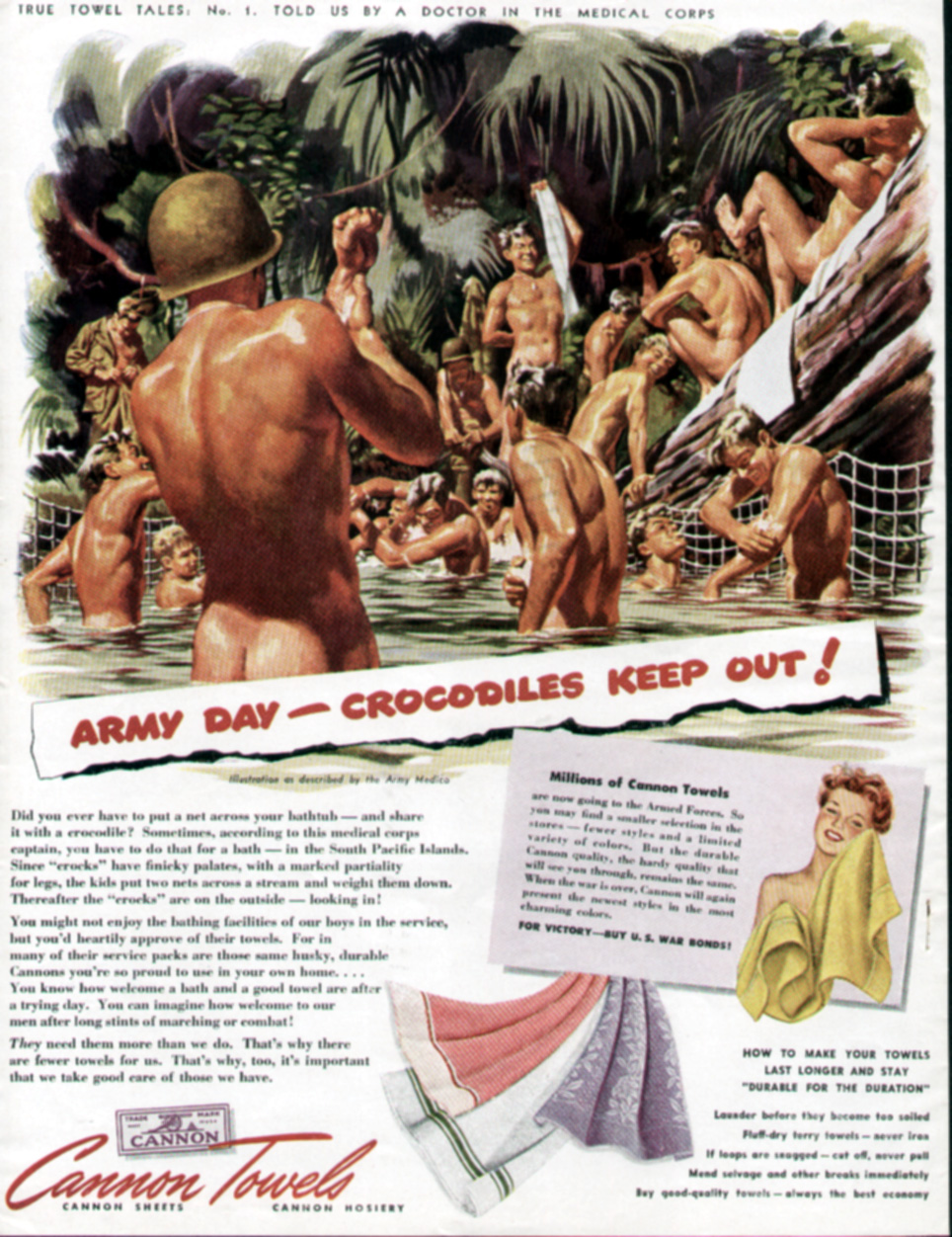 “The focus of these ads was on the value of Cannon towels to the soldiers, but the images were homo-erotic enough to allow for an alternate interpretation by a gay man,” says Edward H. Sewell (2005).