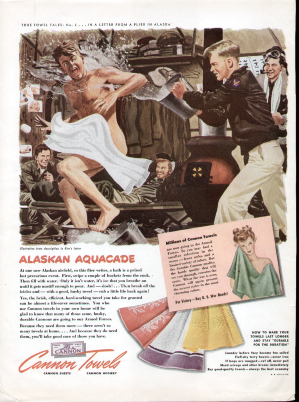 Lest these ads be misrepresented, let’s go on record here and now by noting that these charming vignettes about life in the armed forces were unequivocally patriotic and domestically informative. Readers were reminded of the reasons they might not be able to find Cannon towels in their hometown shops — because “our boys in the service need them more than we do, so there are fewer to go around” — and given tips on how to make their towels last longer and stay “durable for the duration.”