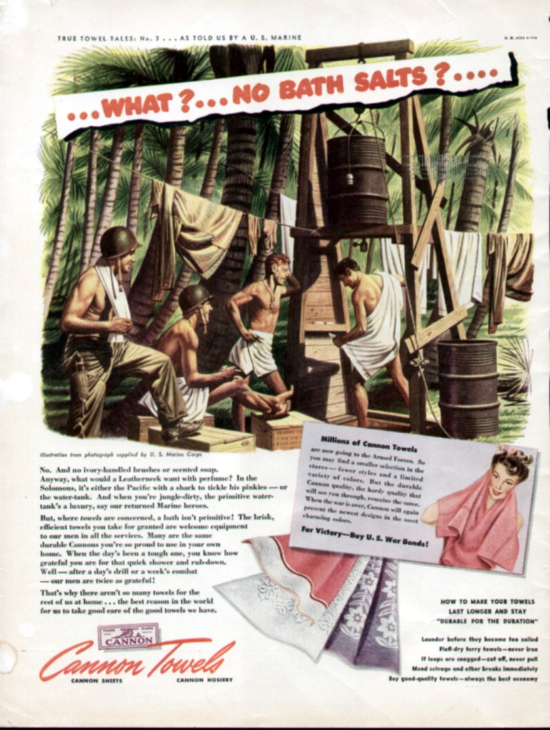 Marines are featured in the third True Towels tale. In “…What? … No Bath Salts? …” (1943) even the illustration is based on a photograph supplied by the U.S. Marine Corps. Here the action takes place in the Solomon Islands, where “it’s either the Pacific with a shark to tickle his pinkies—or the water-tank.” When you’re “jungle-dirty” — as are these fighting men who take a break from battle to towel off and admire their handiwork — “the primitive water-tank’s a luxury,” claim our returned Marine heroes. Fortunately, where towels are concerned, the bath isn’t that primitive because the “brisk, efficient (Cannon) towels you take for granted are welcome equipment to our men in all the services.” Yep, welcome “equipment.” Towels!