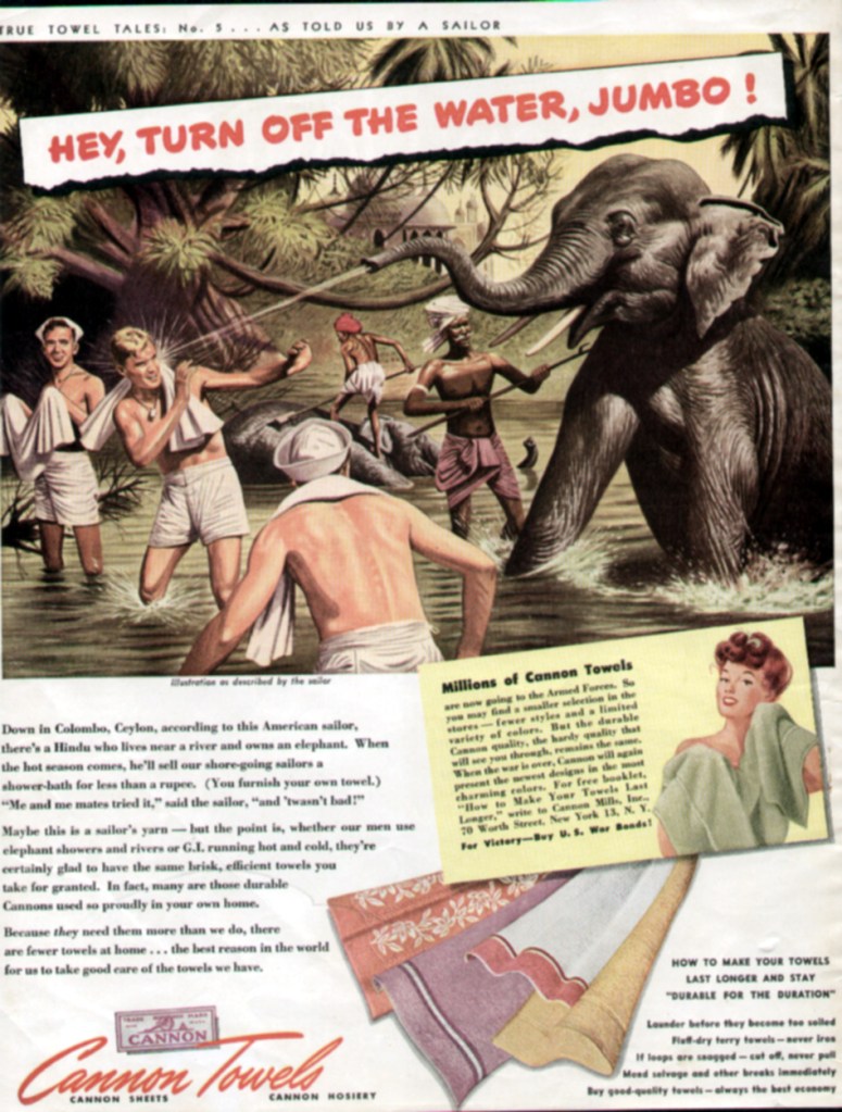 Now imagine yourself in boxer shorts, taking a bath with an elephant. That’s the scenario in “Hey, Turn Off the Water, Jumbo!” Cannon’s True Towel Tales No. 5. As told by a soldier, this 1944 ad shows Americans in Ceylon where an elephant hoses down the sailors with its trunk as natives wash the pachyderms. According to the story, “…there’s a Hindu who lives near a river and owns an elephant. When the hot season comes, he’ll send our shore-going sailors a shower-bath for less than a rupee.” Of course, one has to bring his own towel! Does the image of being hosed off by an elephant seem exciting … or appealing and tawdry? “Me and my mates tried it,” sez the Sailor, “and ‘twasn’t bad!” It’s different strokes for different folks as this ad goes to show that not everyone is comfortable with a jumbo hose, mate.