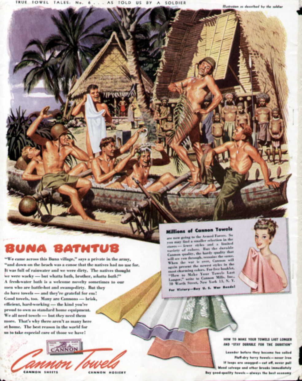 Fieldcrest Cannon’s final True Towels Tale (#6) was also published in 1944 and deals, again, with our Army men. This time they’re center sage in an abandoned canoe, taking a nude bath while the natives form an audience. As the villagers look on, a soldier playfully poses and vamps with a palm branch barely covering his body. Is this a bath … the “baths” … or a drag show? The canoe was full of rain water “and we were dirty,” explains the soldier. “The natives thought we were whacky—but whatta bath, brother, whatta bath!” Like the other ads in Cannon’s campaign, the men here seem to enjoy looking at each other’s nude bodies. This ad in particular seems to focus on a man pretending to be in drag, entertaining the men — some sitting between each other’s legs. One soldier looks on and whistles as, puzzled, the natives watch from afar.